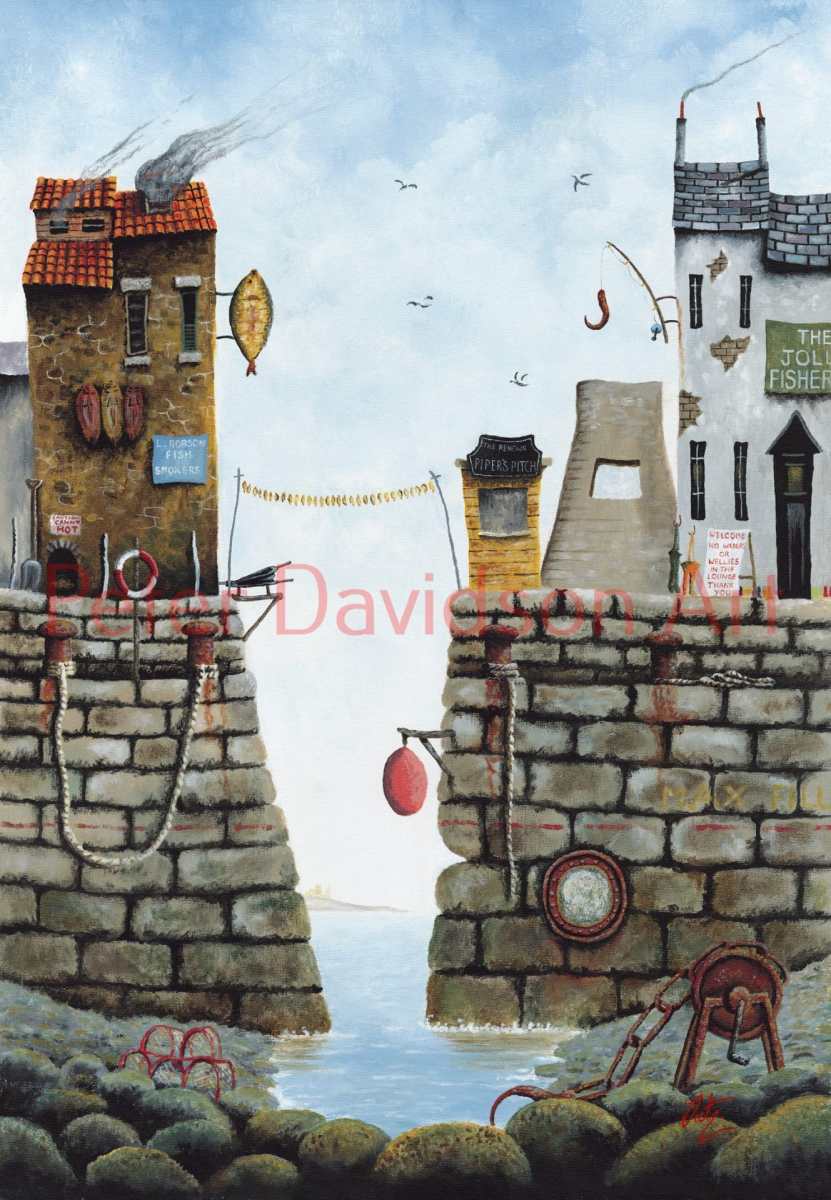 Limited edition Giclée print. The North East coastal village Craster is world famous for it’s smoked Kippers. This is my quirky take on its harbour entrance