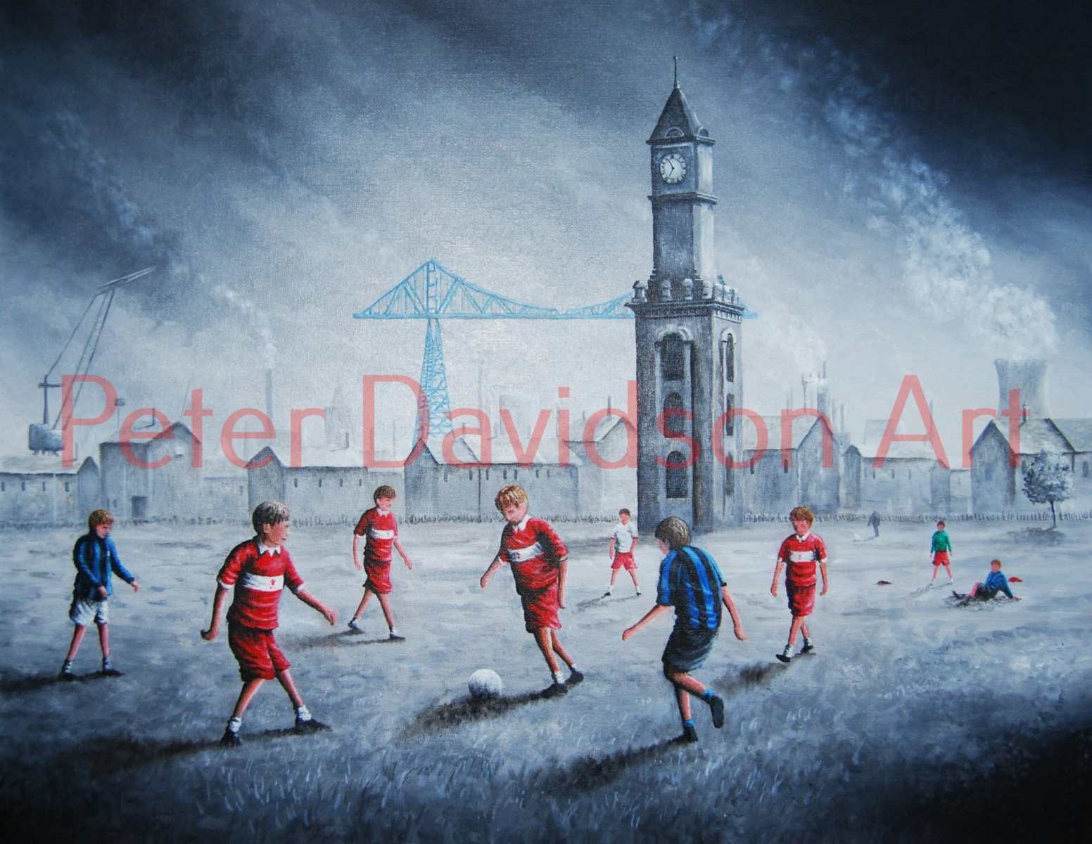 Limited edition Giclée print. Playing football with the famous Transporter bridge in the background in a place the Middlesbrough locals call over the border